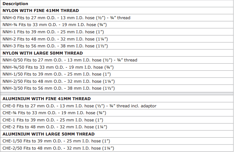 Các khớp nối được làm từ vật liệu bằng đồng và thép cao cấp hoặc nhựa nylon siêu cứng. Khóa lật cho phép kết nối các ống nối kích cỡ khác nhau từ 1/2 "đến 1-1 / 4" nếu muốn. Khớp nối dài thêm để tăng thêm độ chắc chắn. Các lỗ vít được bố trí để cố định chặt ống dây(Chú ý: Kích thước vít không đúng có thể gây ra sự đâm thủng ống).